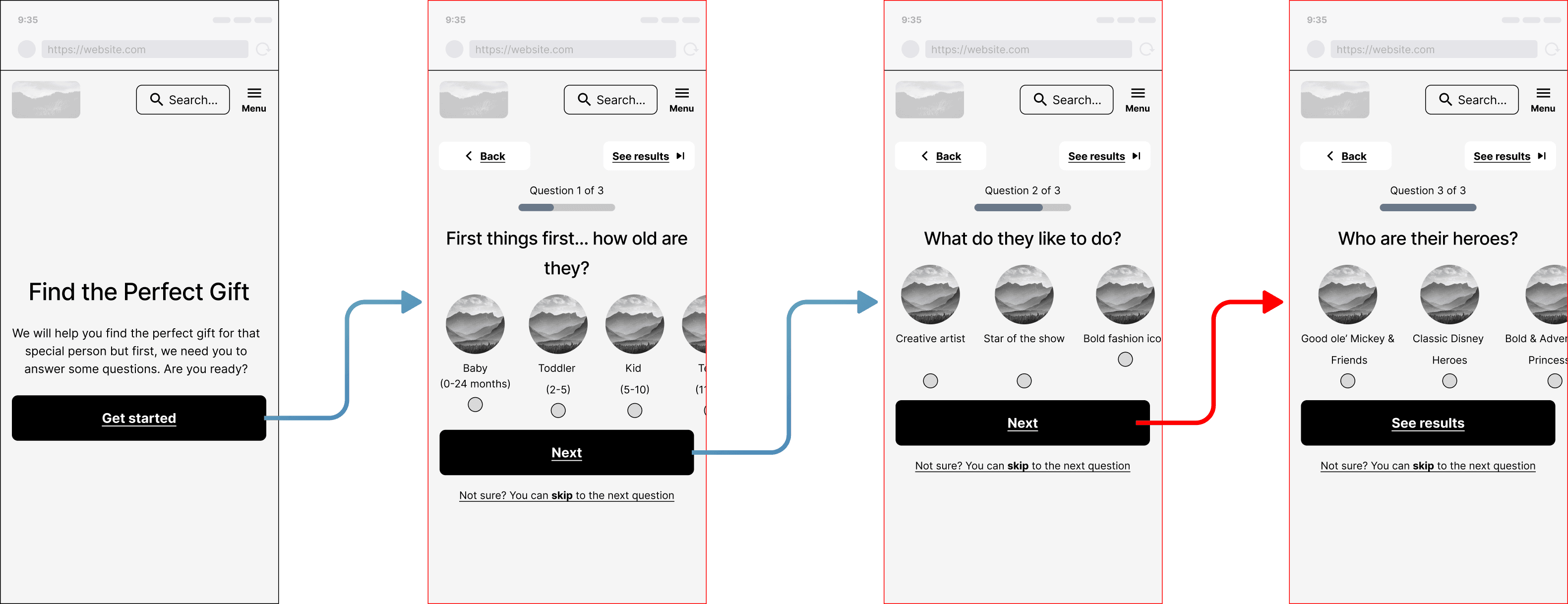 I led wireframing, ideation, and iterative design for the Gift Finder. The quiz interface was structured around three key inputs: age, interests and favourite character types.