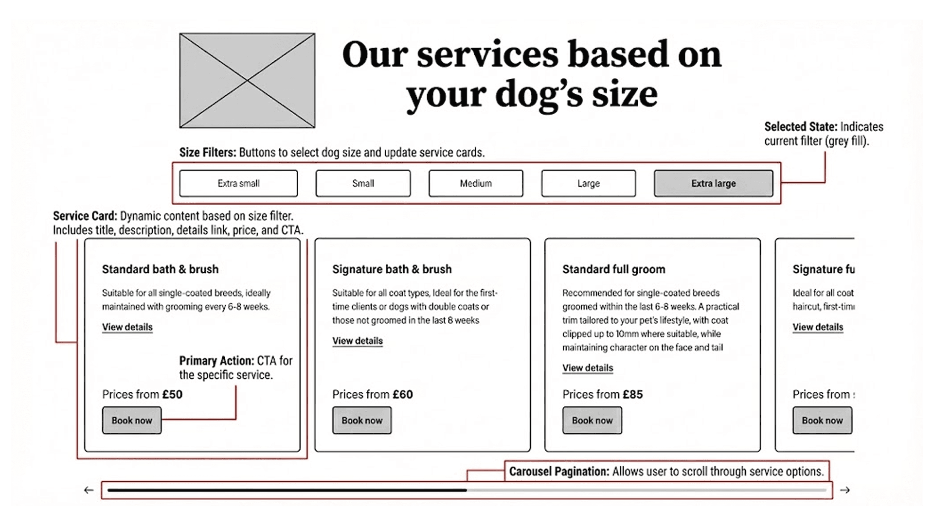 This solution allows the user to filter by their primary concern (dog size) and then display all relevant service options in a clear, comparable format for that size.