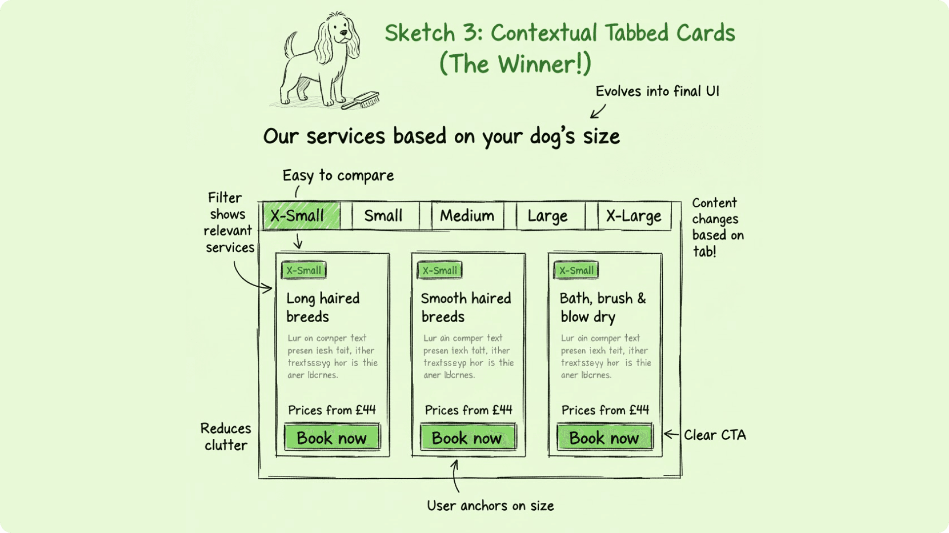 The redesign led to tangible improvements across the booking journey since it allows the user to filter by their primary concern (dog size) and then display all relevant service options in a clear, comparable format for that size.