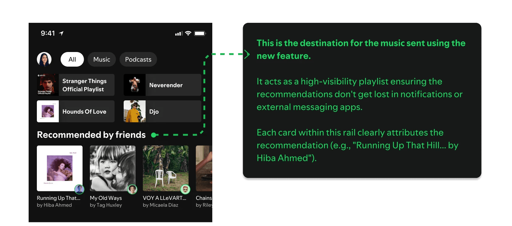 This dedicated placement directly solves the pain point of recommendations getting lost in external chats by giving them a permanent, high-value home within the Spotify app itself.